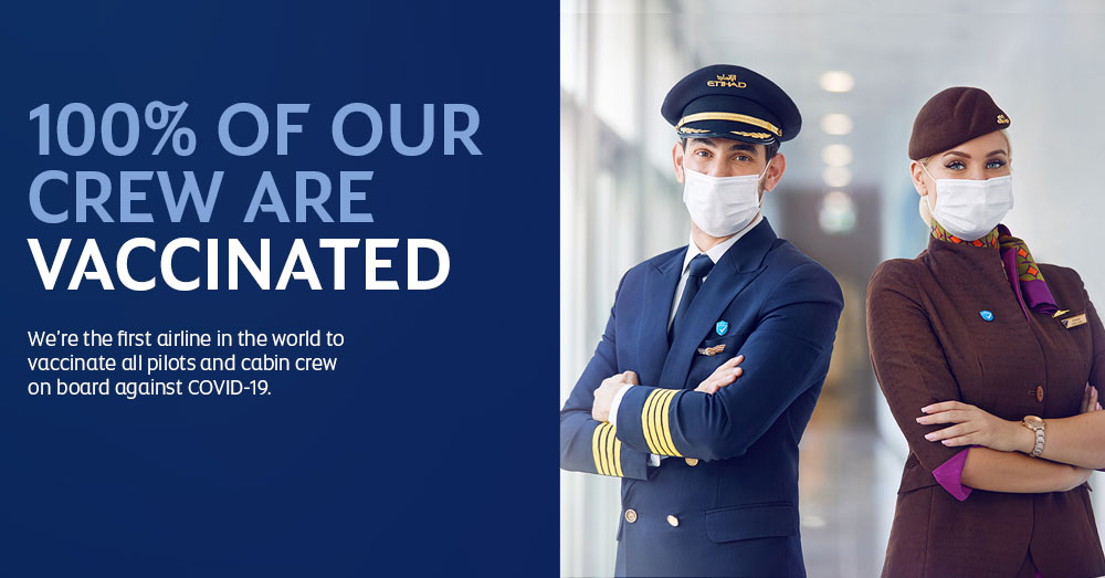 نحن لسنا شركة الطيران الوحيدة في العالم التي جعلت فحص كوفيد-19 إلزامياً قبل كل رحلة فحسب، بل نحن الآن أيضاً الشركة الوحيدة التي قامت بتطعيم أفراد طاقمها على متن الطائرة بنسبة 100%.