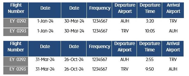 جدول الرحلات للخدمات الجوية أبوظبي - تيروفانانتابورام، يسري اعتباراً من 1 يناير 2024: