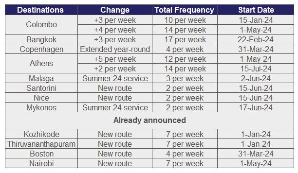ويأتي الجدول الصيفي الجديد بالإضافة إلى الوجهات الجديدة التي تم الإعلان عنها بالفعل لعام 2024، بما في ذلك مدينتي كوزيكود وثيروفانانثابورام في شبه القارة الهندية، ومدينة بوسطن في أمريكا الشمالية، ومدينة نيروبي في شرق إفريقيا.