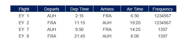 أربع رحلات إضافية أسبوعياً تربط أبوظبي بفرانكفورت، عاصمة المال والأعمال في ألمانيا وإحدى أهم العواصم المالية العالمية.