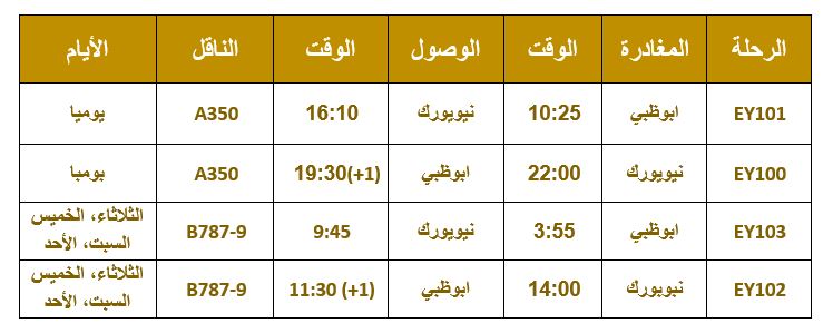 جدول الرحلات بين أبوظبي ونيويورك، EY103/EY102، اعتباراً من 15 نوفمبر 2022: