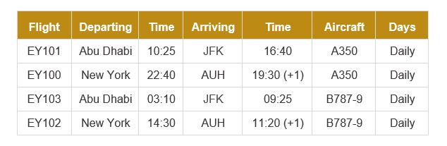 Flight schedule for Abu Dhabi – New York service, effective 24 April 2023: