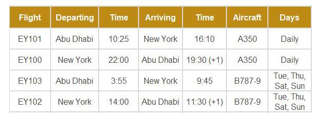 Flight schedule for Abu Dhabi – New York service EY103/102, effective 15 November 2022: